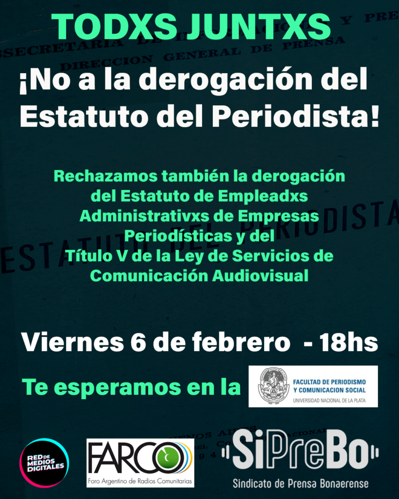 Este viernes 6 en la Facultad de Periodismo y Comunicación Social (UNLP) nos reunimos periodistas, comunicadores y comunicadoras de la región junto a autoridades de esta unidad académica, para seguir planificando acciones en defensa del Estatuto del Periodista, ante el intento de derogación que impulsa el gobierno nacional.